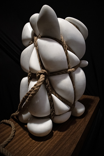 The sculpture consists of a piece of marble,embraced and compressed by a rope that surrounds it. The rope presses on all sides, creating bulges at various points, similar to a balloon that is about to burst. These bulges add a sense of suffocation and pressure, highlighting the action of the rope and the reaction that arises from it.