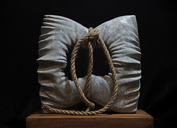 In this work, the word is represented in the form of a rope. The tightening that causes the illusion of creases in such a hard material indicates the contradiction between the irresistible hardness of the stone and the absolute power of the words, which is capable of bending even the most resistant personalities. Through this sculpture, the invincible power of the word is emphasised, which can inflict deep wounds even on the strongest characters.