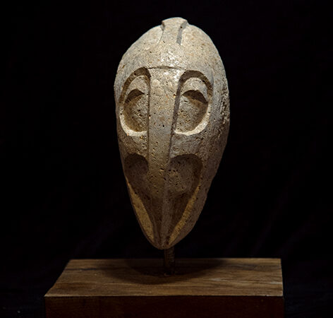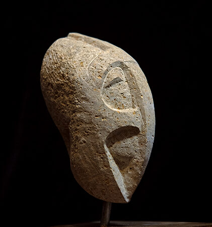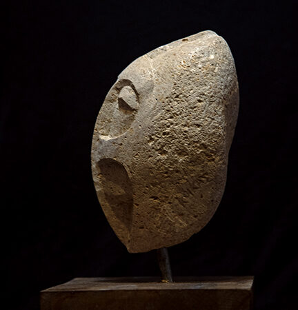 The work is a powerful depiction of the struggle and despair of women under the domination of patriarchy. The material, Cretan Travertine, gives a sense of authenticity and resilience to the piece. The abstract face, with distinct eyes and a silent mouth hidden by a veil, highlights the muted scream and the absence of expressions. They are under the constant shadow of a sword, symbolizing the insecurity and danger they face. Overall, the work dramatically showcases the agony and pain of women living under domination and threat.